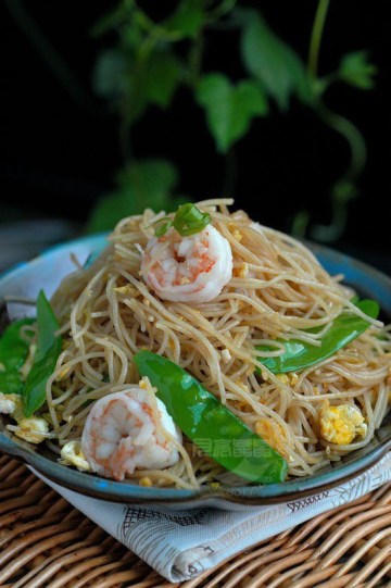 米粉,虾,鸡蛋,荷兰豆,食用油,蚝油,生抽,鸡精