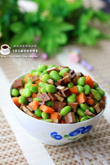 4,毛豆炒至变色后,倒入香干和胡萝卜粒,放入盐和香油即可。