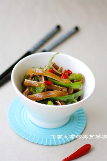 6.翻炒均匀后,加入青椒丝,白糖,起锅时倒入盐即可