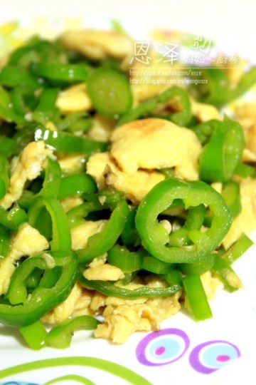 1.尖椒切圆圈、鸡蛋加点生抽打散,热油,放入尖椒翻炒,加点盐和鸡精,断生即可。不用装出搁一旁