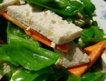 3、上笼用中火蒸至断生(约5分钟),取出晾冷后,用刀切成宽条,裹上一层细干豆粉。