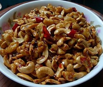 3、锅里留少许油,放花椒粒焙出香味后捞出,放辣椒干焙至颜色暗枣红,放葱、姜、蒜焙香,放少许豆瓣酱煸炒出红油,放糖醋(比例相同哈)滴几滴酱油,倒入鸡丁(要尝哈,有时买来家滴豆瓣酱是非常咸滴),倒入事先调好的水淀粉后,放腰果,翻炒几下即可。