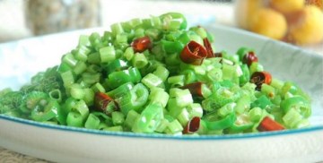 1.把通心菜的叶儿和梗儿分开摘出来,洗净。把菜梗切成小段,用少许精盐拌一拌,腌10分钟左右。青椒切成小丁。