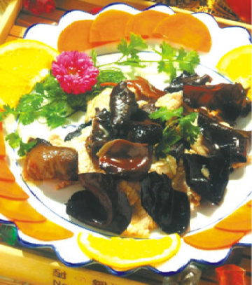 3、锅中放入油加热,加肉片炒至2分钟后加入木耳同炒,加上清汤、精盐焖上5分钟即可。