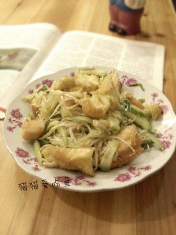 4、锅中底油,油热放姜片 蒜爆香一下后,倒入焯水后金针菇油条。加盐大火炒个2分钟放入黄瓜翻炒起锅就可以了。