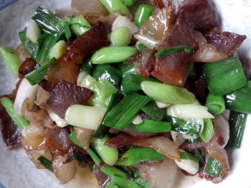 风吹腊肉300克,蒜苗200克