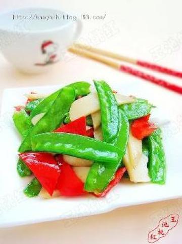 5.荷兰豆和红椒块,快速翻炒,加入盐、白糖、生抽翻炒均匀,最后加鸡精即可