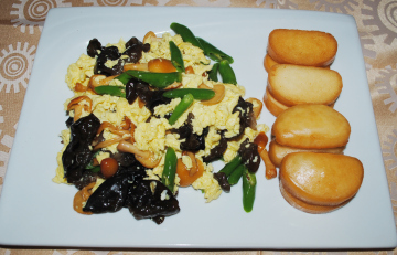 鸡蛋、木耳、杭椒、大蒜、滑子菇、刀切馒头。
