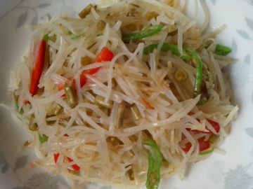 2、热油锅里先放豇豆炒香,再放土豆丝和辣椒一起翻炒至熟,起锅时放点盐和鸡精即可。