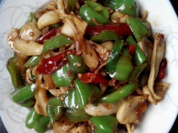 2、热油锅里放泡椒、泡姜、花椒,豆瓣炒香,加墨鱼仔放料酒一起炒,再放青椒炒至熟,起锅时放点鸡精和香醋即可。