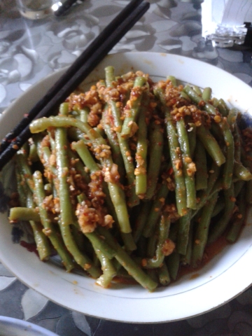 豇豆洗净,切4-5cm上的段儿备用。烧开水把豇豆焯一下(一般方法过油炒,这里用热水焯为了减少爆炒的时间,既可以不把屋子搞得油烟,更重要的是保留豇豆的营养成分)。接下来如把油锅加热放油,豇豆放入翻炒,加盐,一点点糖,不断翻炒,最后放蒜末、鸡精。出锅装盘。