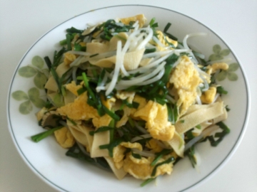 3、锅中放油,放入姜片煸炒放入豆皮,豆芽,葱花,鸡蛋,韭菜,盐,生抽,粉丝,煸炒片刻。放入鸡精出锅即可。
