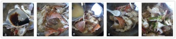 5.下螃蟹、咖喱粉、红糖、盐、料酒、水稍微煮一下。