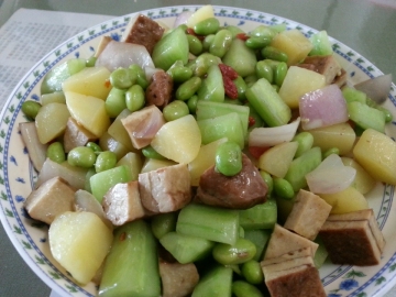 土豆,黄瓜,豆腐干,洋葱,毛豆,盐,色拉油,枸杞几粒