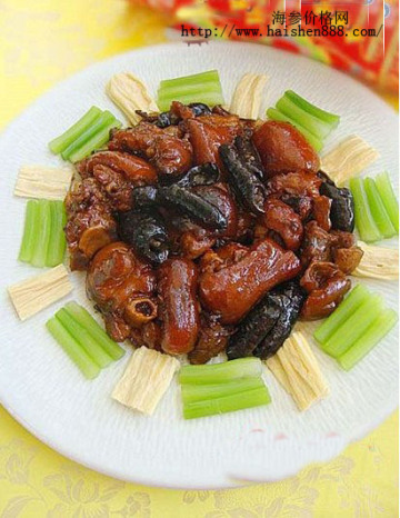 12、将压好的猪手和海参一起焖至收汁加适量盐,鸡精调味后装盘。