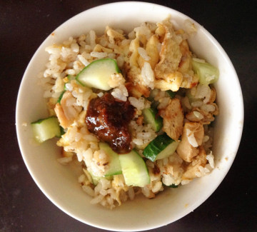 黄瓜1根,鸡胸肉100g(大约一块鸡胸肉的量),鸡蛋2个,隔夜的米饭1碗,生抽,香油,黑胡椒粉,盐,鸡精