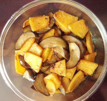2、热锅凉油,放入南瓜和茄子翻炒。
