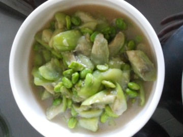 2.炒锅加油烧热放毛豆煸炒变色,加丝瓜,盐,糖,少许水,炒毛豆熟即可