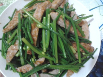 2.锅内放油,先爆炒墨鱼干2分钟后,推入辣椒丝,洒一匙鱼露(fish sauce),翻炒一下就加入韭菜花,等韭菜花有熟色就起锅.