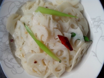 3、热油里先放入花椒和辣椒再放藕和大葱翻炒片刻,放入盐和鸡精翻炒哈起锅即可。
