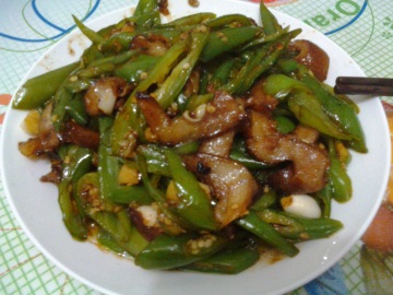青椒1斤,卤猪脸肉半斤,蒜头4粒