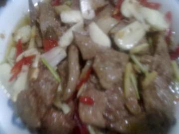 2、热油锅里放入,花椒、豆瓣、葱白炒香后,放入猪肝爆炒再加青红辣椒,炒几十秒钟,加味精即可,装盘。