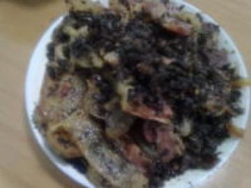 2、干盐菜(青菜)切(剁)碎。锅内烧热加油放入盐菜翻炒,中途加少量水烧干略炒装盘待用。