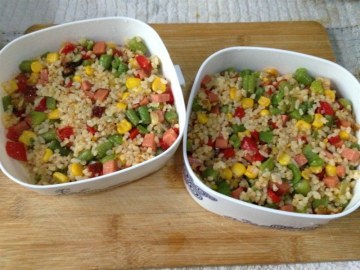 米饭,鸡蛋,豆角,红辣椒,火腿肠,玉米粒,青豆,胡萝卜,葱,盐,鸡精