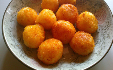 3.油锅烧至五成左右热,放入土豆球,小火炸至表面金黄、外壳稍硬即可。捞出后用厨房纸吸去余油,趁热吃最好拉!