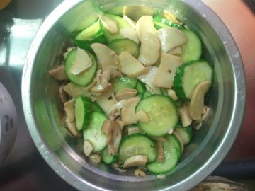 1、鸡腿菇切片,黄瓜切片,蒜切丁。