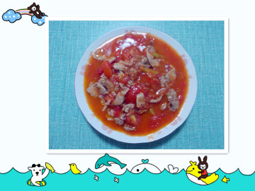 3.锅内剩底油,下番茄炒熟,倒入肉片翻炒,加盐。关火加味精(也可以不加味精)起锅装盘即可。