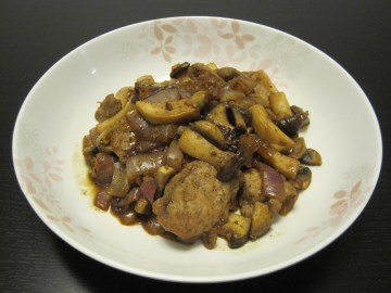 6、加入步驟(3)和一點點水翻炒,至菇差不多熟了加入步驟(4)翻炒,至肉差不多熟了加入醬油2匙,適量黑胡椒粉和黑胡椒碎翻炒均勻,裝盤。