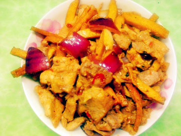 7、刷干净锅,倒入猪板油,加热后,倒入洋葱,然后倒入猪肉片炒熟。
