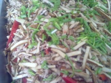 5、再放入炒肉丝炒匀放入鸡精、葱花出锅即可。