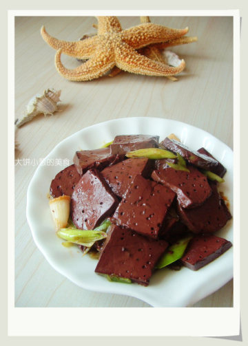 6.血块炒熟,放入大葱,入盐继续炒。