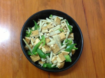 6、加入淮山略煮后加入青椒炒匀加入调味料调适味即可。