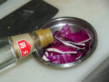 2. 紫甘蓝洗干净,切块,倒少许白醋腌渍一会儿待用。