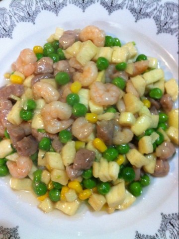 虾仁和肉丁一起加蛋清 淀粉盐 胡椒粉 料酒 腌制 2小时以上 豌豆 玉米 茭白切丁 备用 准备起油锅 先煸炒杂菜放少许盐 一点点的生抽 然后倒入 虾仁 肉丁翻炒 加鸡精 勾芡 撒胡椒粉 淋上香油 ok了