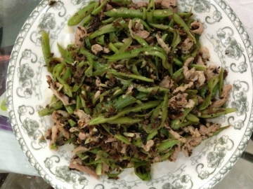 芹菜炒猪舌头、肉末炒豌豆、韭菜炒香干、卷心菜炒粉丝