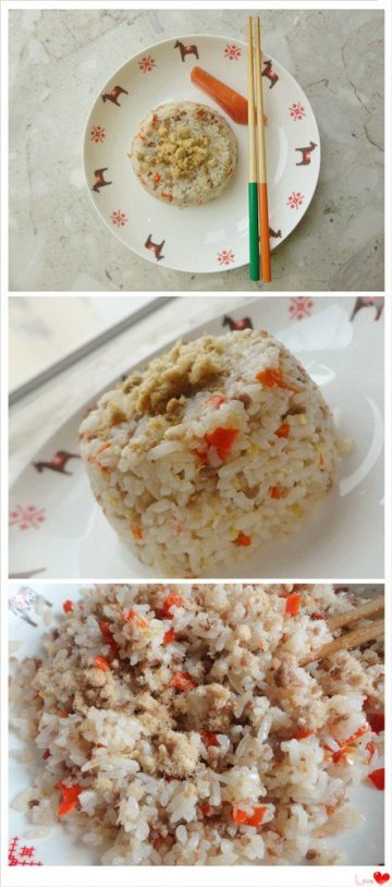 4、关火。在炒好的小米椒牛肉末饭里加原味肉酥!拌在一起特别香!