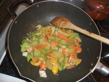 5、炒2-3分钟后放入佛手瓜(如果锅干可以放点儿水)
