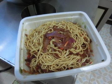 4、炒洋葱的时候,等洋葱丝变软和味道散发出来后,倒入一般的炒面的酱料包,拌匀~然后捞起来,倒入水分吸收掉的炒面上,先拌匀,然后再倒入剩下的一半的酱料即可!