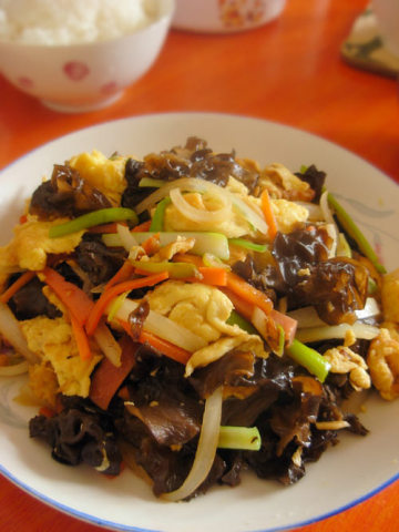 鸡蛋3个,洋葱半个,胡萝卜半根,木耳 50g,火腿50g,葱适量,盐2g,鸡精0.5g