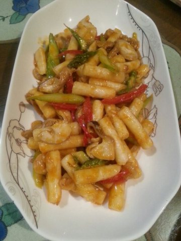 草菇、肉丝、红椒、虾仁、芦笋、年糕