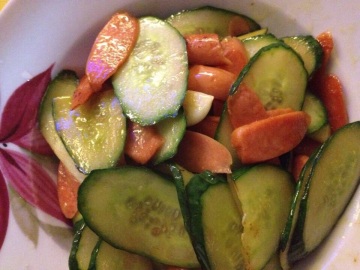 黄瓜1条、火腿肠2根、葱1条、蒜头1瓣