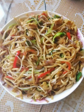 电饭锅版杂菜炒粉丝、丝瓜炒花生米、爆炒木耳蛋蛋面。