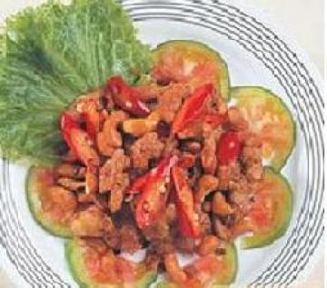 1.将去骨鸡腿肉切成丁状,用腌料腌10分钟备用。2.沙拉油以强微波加热1分钟后,放入腰果和调味料a拌匀,用强微波加热3分钟。