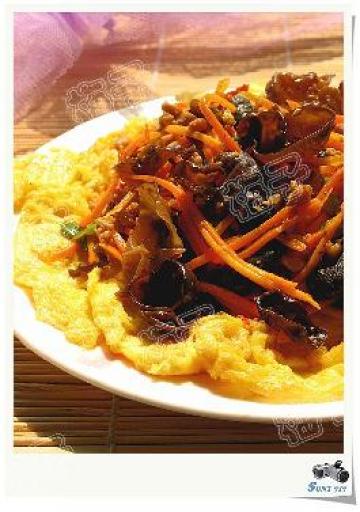 1.云耳泡发洗净.红萝卜一条刷丝,肉末用酱油生粉香油拌匀放一会.鸭蛋两个放点盐打匀先煎好用锅铲切成几大块铺在碟底.