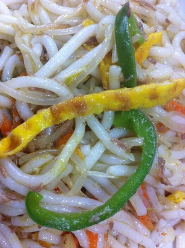 2.把菜炒好,先放洋葱炒香,再放不容易熟的胡萝卜丝,炒两分钟后再放黑木耳,韭菜,西兰花等,出锅前加点盐;炒得八成熟就好,盛出来备用;