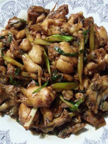 5、差不多时放入芦笋翻炒,加点盐、一点鸡粉,放入葱段再翻炒一下即可出锅,香气四溢的醬爆野山鸡做好了!先尝一口试试,哇塞,太好吃了,鲜美无比!
